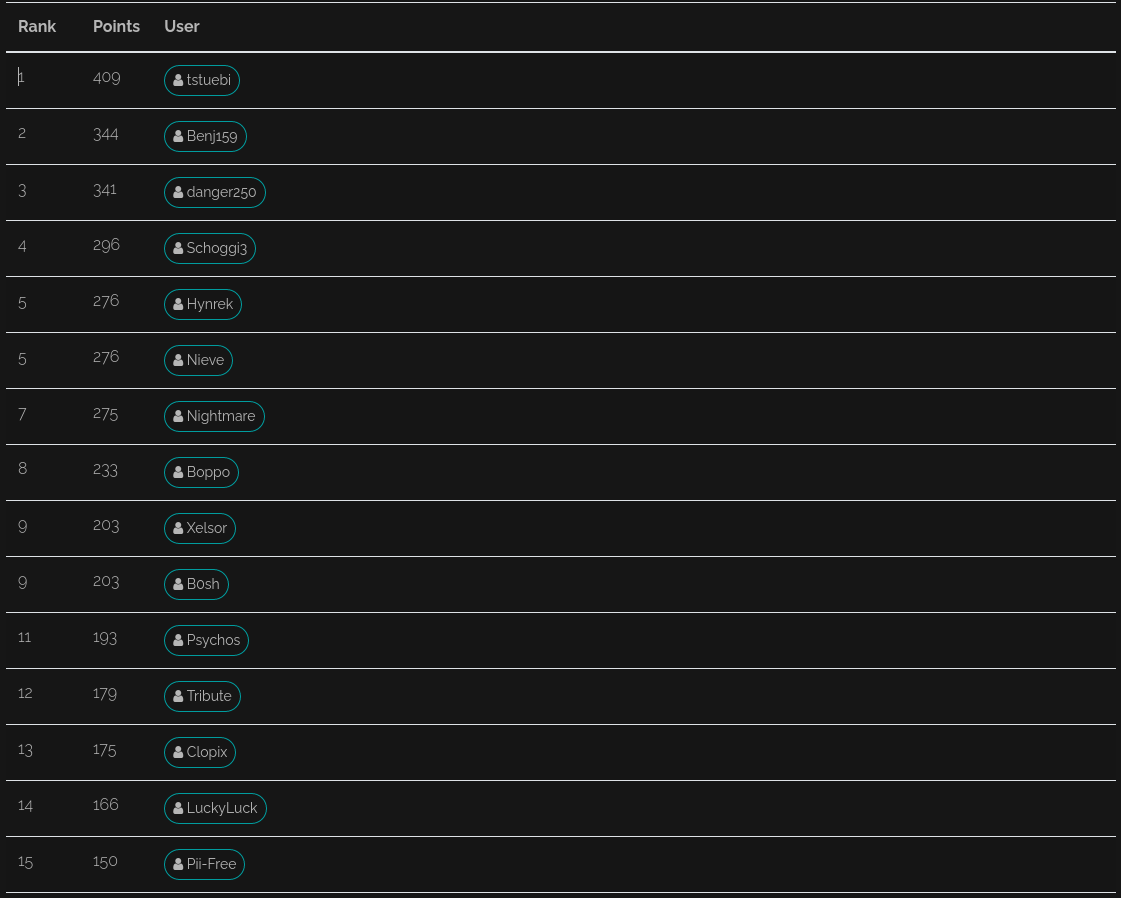 Das Schwinger Prinzip wurde angewandt und so konnte sich tstuebi als Verdienter Sieger mit unglaublichen, nie erreichten 265 Punkten als erstes am Gabentisch sein Preis aussuchen. Herzliche Gratulation. Obwohl böse Zungen behaupten das Tstuebi gedopt war mit der höchsten Konsumation von Bier.